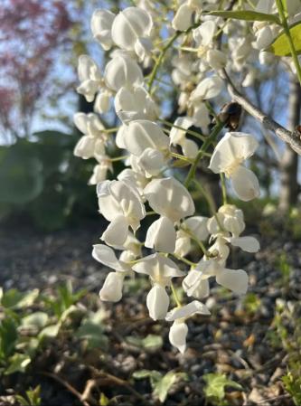 这株白花紫藤(Wisteria sinensis f. alba)在春季正常开花后,经过科学修剪和营养调控,果然在夏季再度抽出花枝,虽花量不及春季繁茂,但清香依旧,更为惊喜的是这株紫藤在春季绽放纯白色花朵后,夏季竟然开出了梦幻的粉白色花序,尤其是花苞粉嘟嘟的,可爱极了!