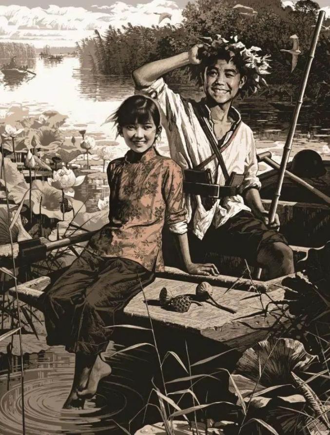 版画《烽火岁月——小兵张嘎和玉英在白洋淀上》。“你们下一站,一定要去寨南。赫赫有名的雁翎队队长郑少臣,队员张亮、张牛、张建安、王贵都是这个村的。”
