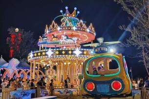 夜晚的旋转木马亮着灯,像童话里的场景,坐在湖边长椅上看超治愈