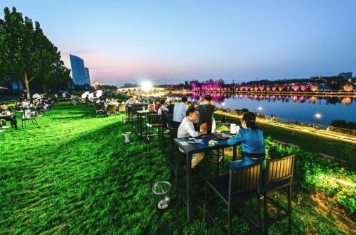 湖边栈道的灯像一串珍珠,租个自行车骑行,感受不一样的晚风
