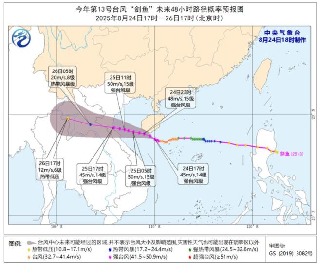 大风预报:8月24日20时至25日20时,南海西部、西沙群岛附近海域、北部湾、琼州海峡、海南岛、广西沿海、广东西部沿海将有6-8级大风,其中南海西北部和中西部的部分海域、北部湾南部海域、海南岛南部沿海的风力有9-11级,“剑鱼”中心经过的附近海域风力可达12-15级、阵风16-17级。