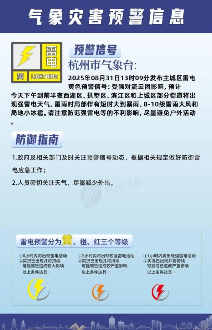 08月31日13时09分,市气象台发布主城区雷电黄色预警信号:受强对流云团影响,预计今天下午到前半夜西湖区、拱墅区、滨江区和上城区部分街道将出现强雷电天气。雷雨时局部伴有短时大到暴雨、8-10级雷雨大风和局地小冰雹。请注意防范强雷电等的不利影响,尽量避免户外活动。