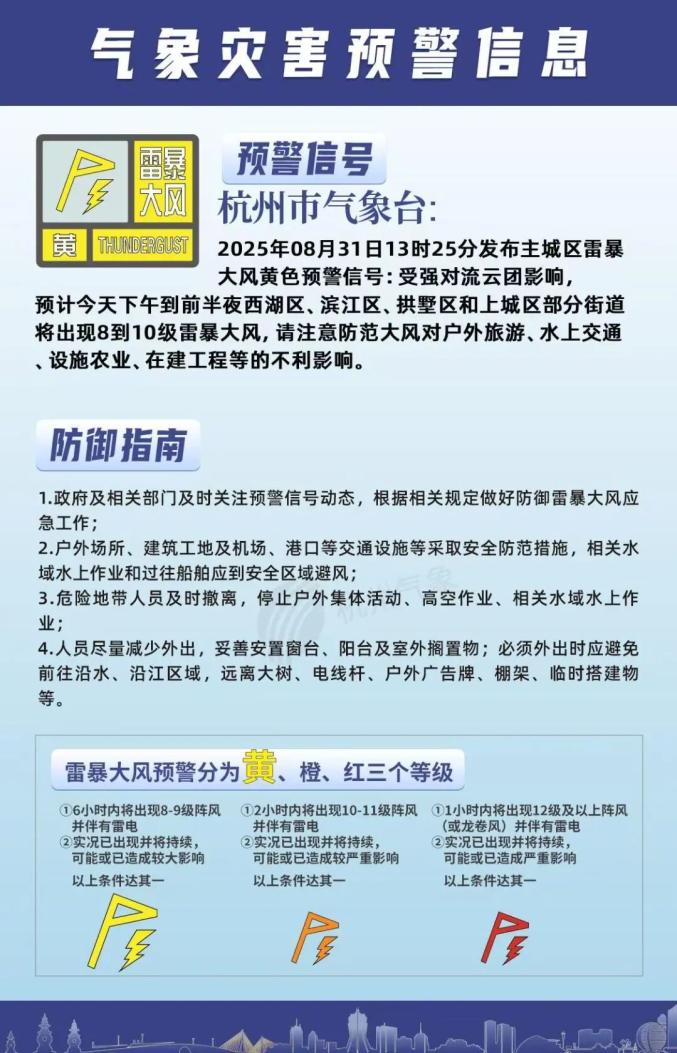 08月31日13时25分,市气象台发布主城区雷暴大风黄色预警信号:受强对流云团影响,预计今天下午到前半夜西湖区、滨江区、拱墅区和上城区部分街道将出现8到10级雷暴大风,请注意防范大风对户外旅游、水上交通、设施农业、在建工程等的不利影响。