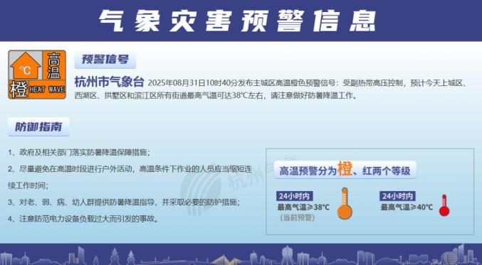 今天早上,杭州市气象台继续发布高温橙色预警信号,请大家继续做好防暑降温工作。
