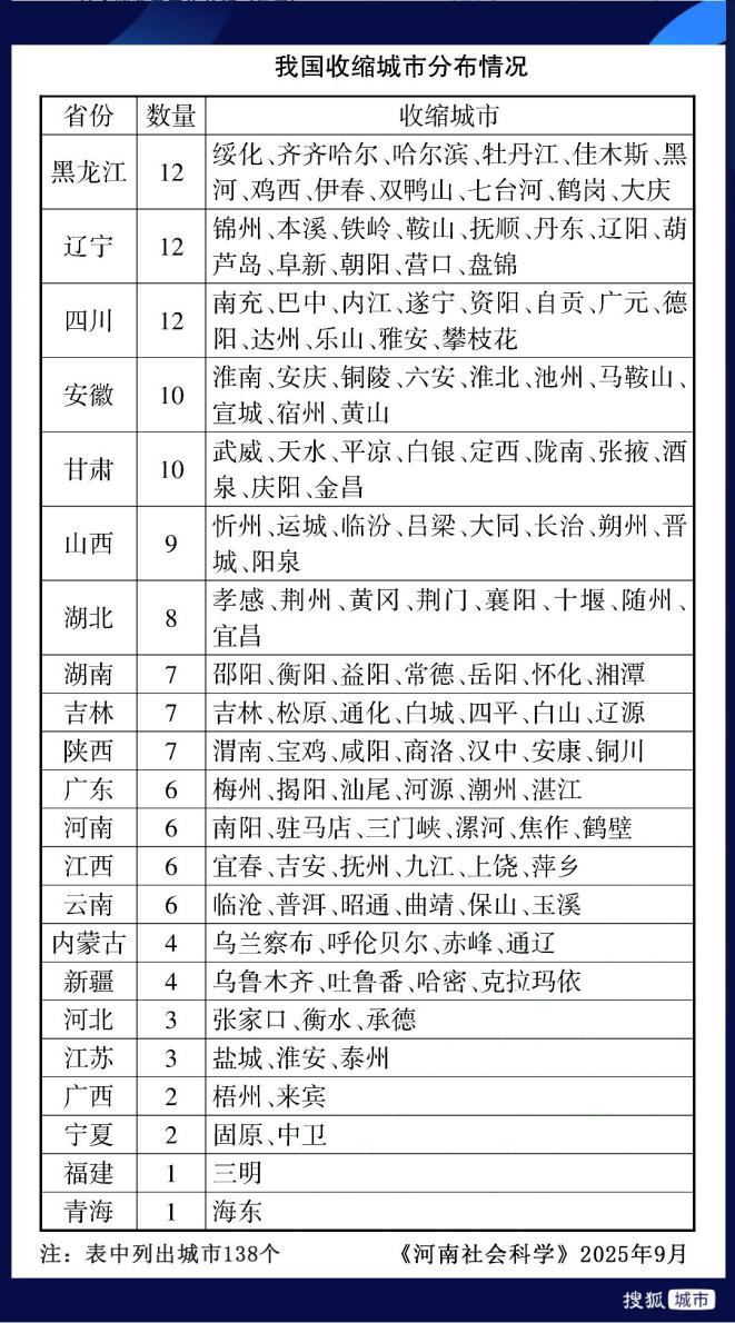 郑州大学教授汤凯通过对比六普、七普数据,识别出139个收缩城市,其中黑龙江、辽宁、四川各有12个,数量位居前列。南京大学教授陈友华团队则从人口、经济、空间三个维度分析273个地级市,发现180多座城市至少在一个维度出现收缩。