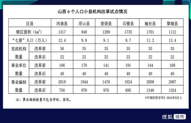 数据显示,全国户籍10万人以下县市206个,占比近一成。这些区域底子薄、财政供养负担重。2020年以来,山西6个小县(6县七普人口均少于15万人,且较六普减少13%-23%)率先推行“大部制”改革,事业单位减至40个,人员编制削减四成。