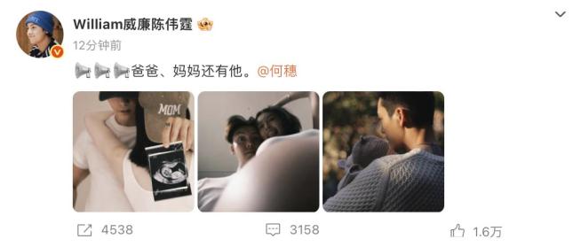 10月18日,演员陈伟霆晒出多张合影,称:“爸爸、妈妈还有他。”并@模特何穗,官宣两人结婚生子。