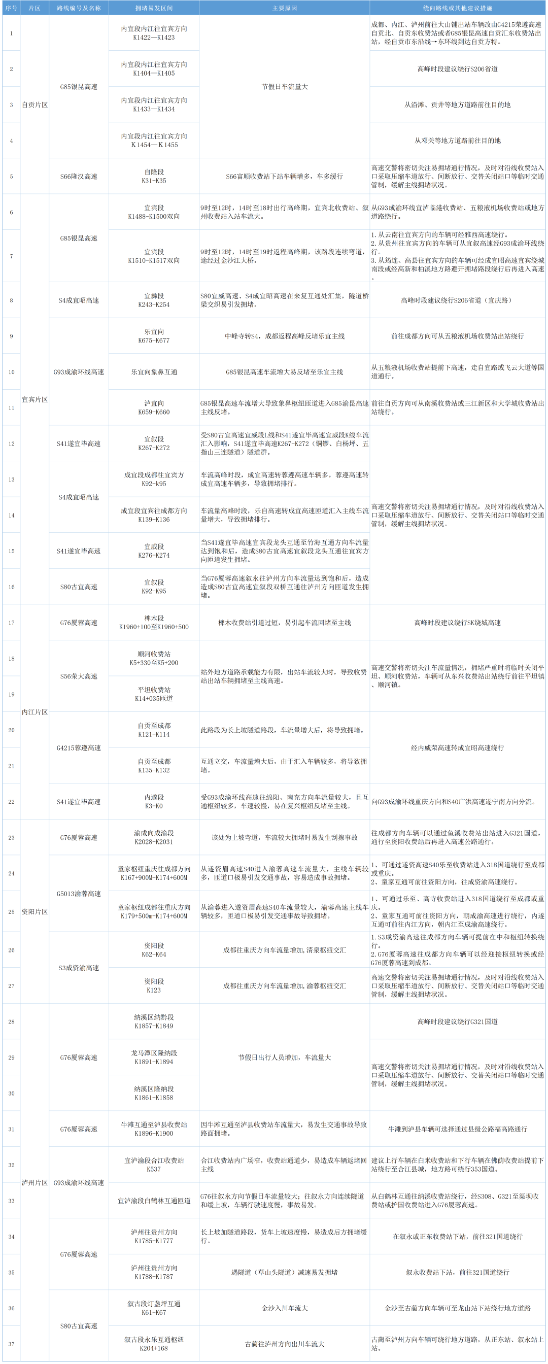 易拥堵路段:成都收费站出入口段、成都站—双流南收费站路段、进入新津服务区匝道、青龙互通成乐分道口路段(双向)。