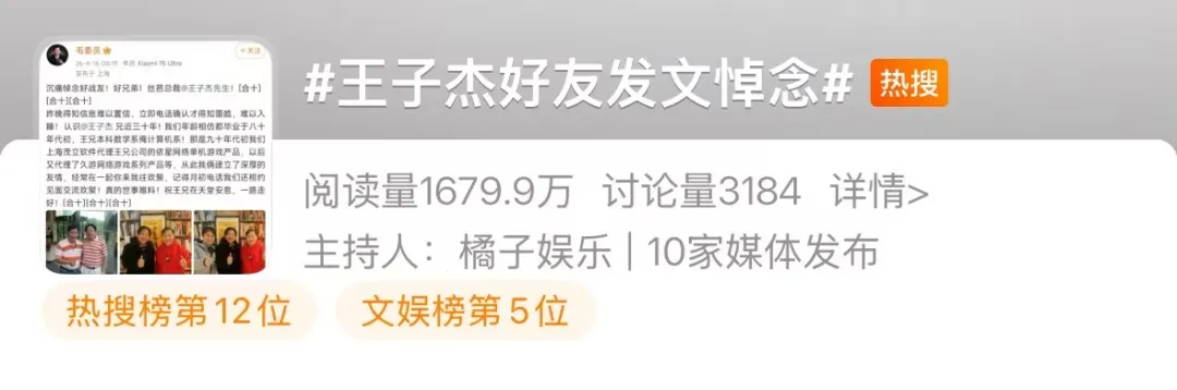 相关话题 #王子杰好友发文悼念 登上微博热搜