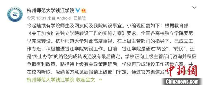 7月19日,针对“杭州师范大学钱江学院可能要停办”的网络爆料,该校在官方微博上进行回应:目前已成立工作专班,积极推进转设工作。