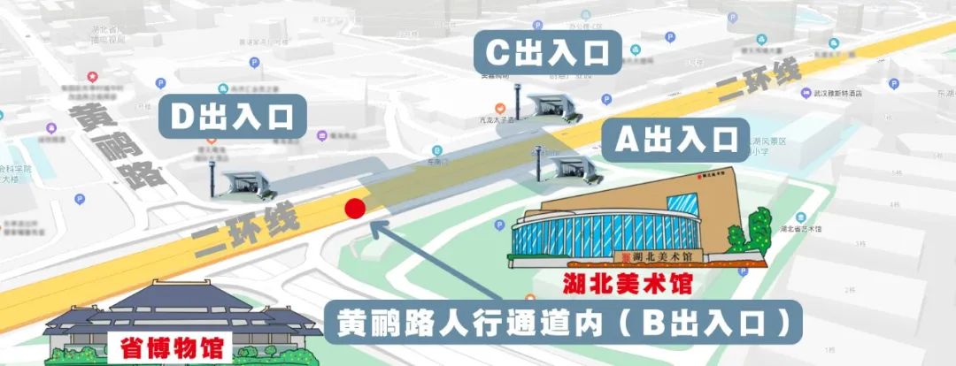 车站的A出口,还有一处文化场所,即湖北美术馆。2011年,由文化部评为“国家重点美术馆”。