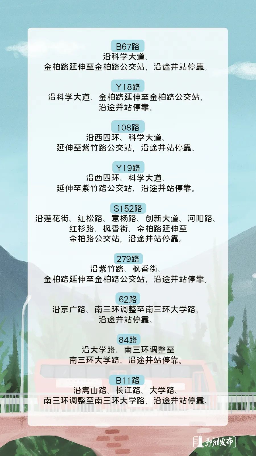 6日,据郑州公交总公司发布消息显示:为更好地服务西区市民出行,进一步扩大高新区公交线网布局,经市交通局批准,郑州公交定于2020年9月9日起,对B67路、Y18路、108路、Y19路、S152路、279路进行优化调整。同时,为配合“一环十纵十横”道路综合改造工程,定于2020年9月10日起,对62路、84路、B11路进行优化调整。