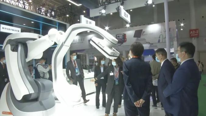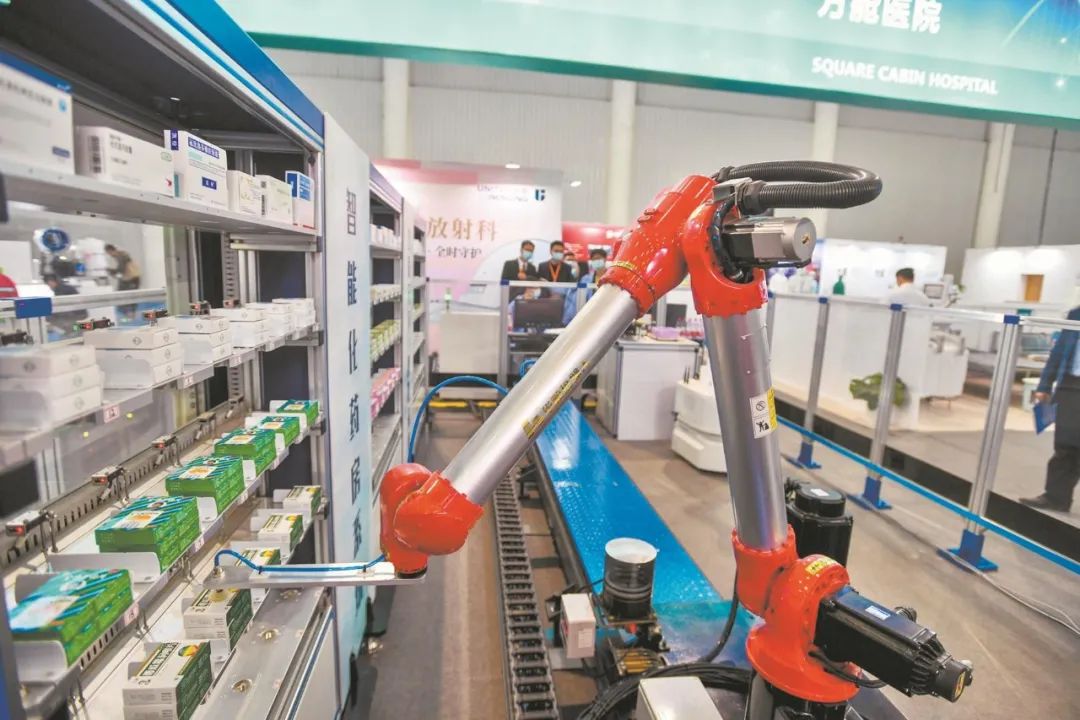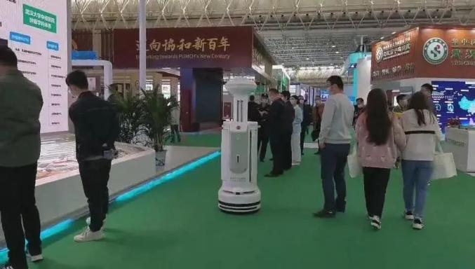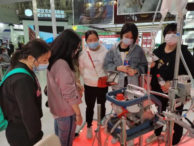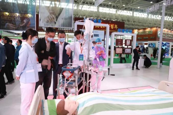 在中南医院展台正中央,布置了一间迷你急救病房,病床边的一台便携式ECMO(人工心肺仪),曾在疫情初期成功救治新冠肺炎重症患者。消毒机器人